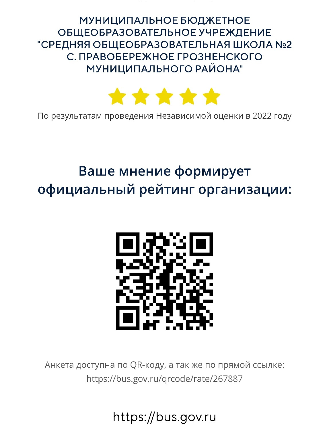 Министерством просвещения Российской Федерации осуществляется работа по проведению независимой оценки качества условий осуществления образовательной деятельности федеральными государственными образовательными организациями, а также иными организациями, осуществляющими образовательную деятельность за счет бюджетных ассигнований федерального бюджета. В целях повышения качества образования Вы можете оставить свой отзыв, мнение о качестве условий осуществления образовательной деятельности организациями, заполнив соответствующую форму и направив ее по адресу электронной почты noko@edu.gov.ru
