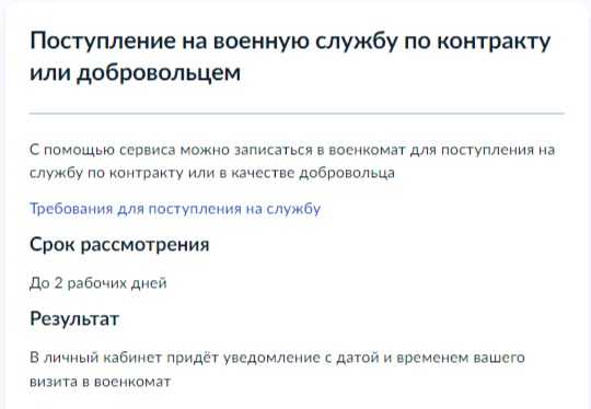 18.05.2023Минцифры РФ информирует, что начиная с 2022 года на Едином портале государственных и муниципальных услуг (ГосУслуги) реализован сервис «Поступление на военную службу по контракту или добровольцем», позволяющий гражданам подавать заявления с целью последующего заключения контракта с Минобороны РФ в электронном виде посредством ЕПГУ.